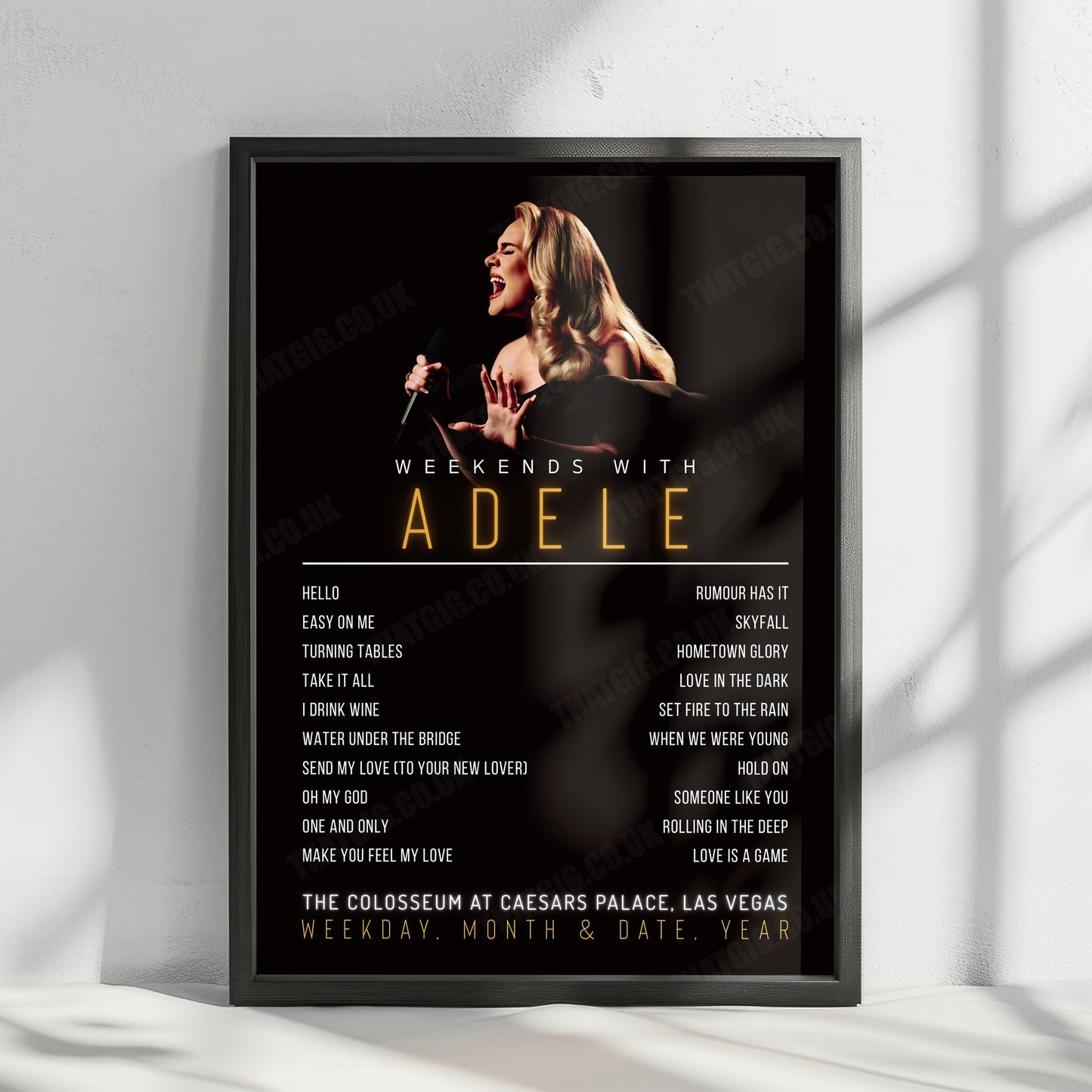 Bring the magic of Adele's concert into your life with this setlist poster. Whether you attended the show or simply love Adele's music, this poster is a treasure that will remind you of the enchanting night in Las Vegas. Don't miss out on owning a piece of music history.
