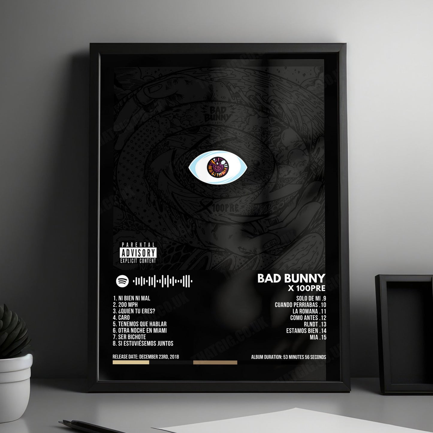 Indulge in the essence of Bad Bunny's musical evolution and gift yourself or a fellow fan the magic of "X 100pre" in the form of this striking poster, a timeless keepsake that celebrates the fusion of art and emotion.